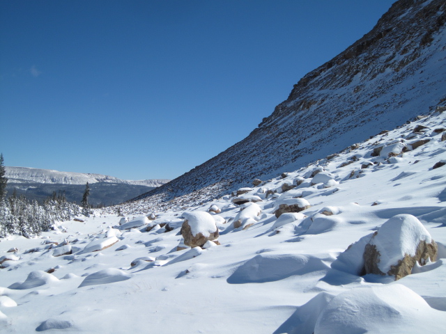 Wow... what a great storm for the eastern front, especially the North Slope and Mirror Lake Highway. Our main man with the plan, Ted Scroggin was out and about yesterday and reports nearly 18" of snow blanketing the high ridges. About half that amount stacked up on the south half of the range. So, just like that... there's enough snow to move around on. And now I think about early season roadside attractions like Murdock Bowl off the Mirror Lake Highway or Wolf Creek Bowl near Highway 35 and Wolf Creek Pass. Easy grabs... right? Even though it might not seem like there's enough snow to avalanche, today you'll want to avoid any steep, wind drifted slope. Remember- even a small wind drift packs enough punch to knock you off your feet and may result in a season ending injury if you slam into a stump, rock, or deadfall barely hidden under the shallow snow.