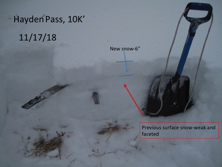 Our main man Ted Scroggin has been out and about, stomping around Bald Mountain Pass and in Whitney Basin since early November. He reports a thin, yet layered snowpack with about 18" of snow on the ground on upper elevation, north facing slopes.
