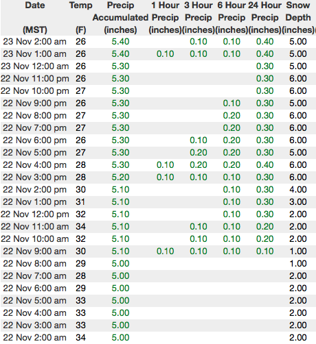 Above are 24 hour temperatures and snow depth from Hayden Pass
