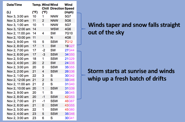 Above is a 24 hour data dump from Lofty Lake Peak (11,186') clearly showing the evolution of yesterday's storm.