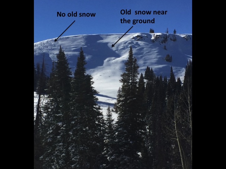 In the wind zone at and above treeline, especially on slopes facing the north half of the compass the avalanche danger is HIGH. Human triggered avalanches are VERY LIKELY on any slope harboring old snow near the ground.