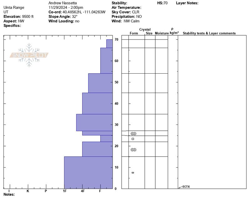 Of course we've seen worse looking snowpacks and it's no shock that our problem child (persistent weak layer or PWL), the sugary, faceted snow near ground is gonna gives us some heartburn. It's a classic, early season, strong snow resting on weak snow structure. Now for the inside line... all the snowpros, I knows, are giving this setup a wide berth because we realize it's a tricky combo.