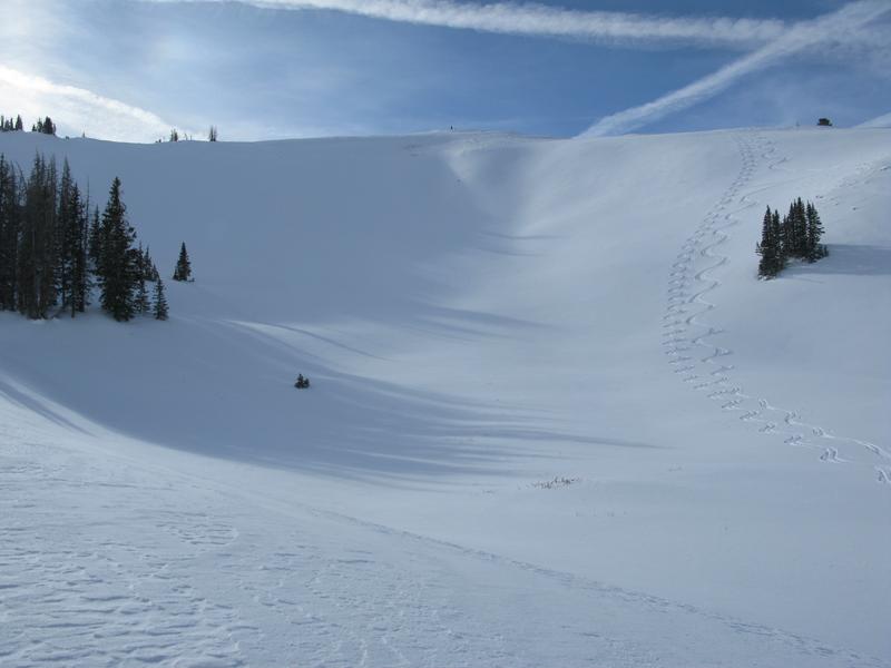 I didn't find yesterday's wind drifts particularly sensitive, but the Uinta's are a huge range and we might still find a wind drift or two that'll react to our additional weight. Found mostly on upper elevation leeward slopes, I expect there's a few pockets of dense snow cross-loaded in terrain features like chutes or gullies. Your best bet for avoidance is to simply steer clear of any fat, rounded piece of snow, especially if it looks chalky or sounds hollow like a drum. In addition, look for and listen to clues like whoomphing sounds or shooting cracks in the snow which are sure signs of unstable conditions.