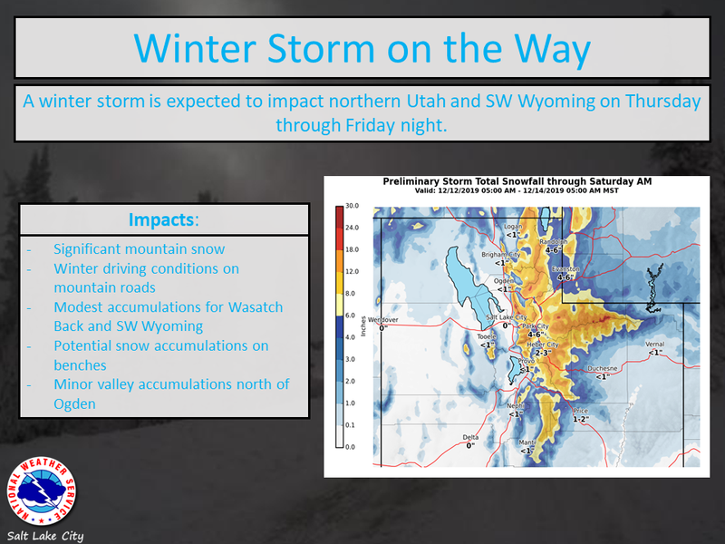 After a short break in snow later tonight through early Thursday, a series of weather disturbances bring an extended period of snow to the northern Utah Thursday afternoon through Saturday.