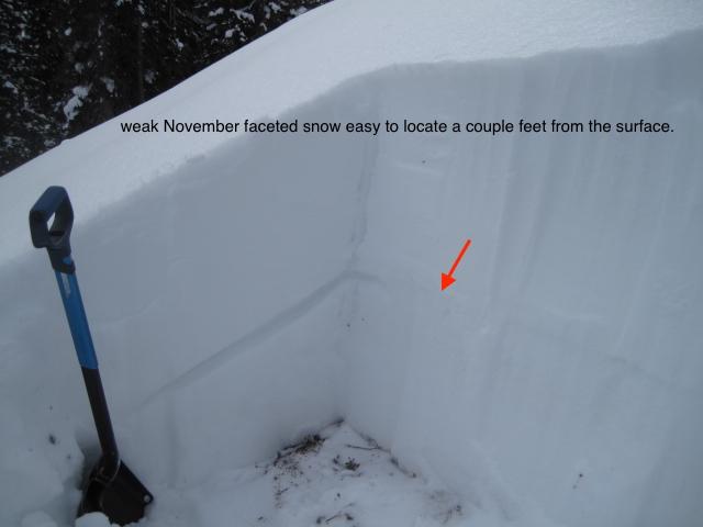 Ted was near Gold Hill yesterday and finds the very apparent mid November faceted snow layer, buried in the mid portion of our snowpack. More on Ted's travels HERE.