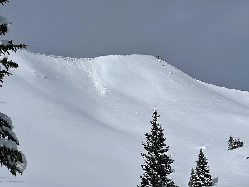 As winds increased Saturday, a piece of cornice initiated this shallow wind drift on a steep, leeward slope near Currant Creek Peak.