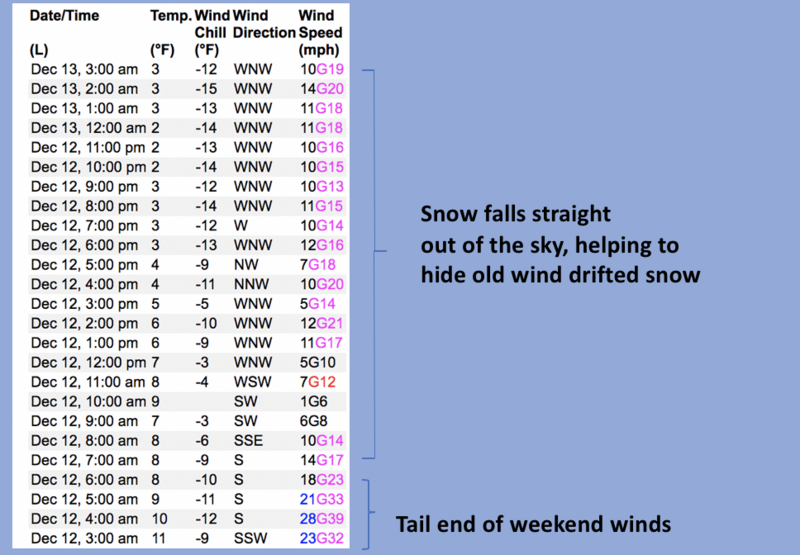 Southerly winds cranked over the weekend,  not only changed the landscape, but also adding an additional layer of strong snow to our pre-existing snowpack.  Problem is... all that strong snow rests on weaker, midpack snow (our problem child, the persistent weak layer or PWL) which formed during the mid November drought.