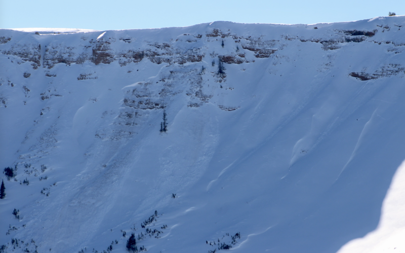 On Monday, I spotted this piece of snow from a distance. Breaking to old November snow, I suspect this large pocket on a steep, rocky, unsupported slope in Upper Chalk Creek occurred late in the weekend storm and was most likely triggered by a small piece of cornice crashing down onto the slope below.