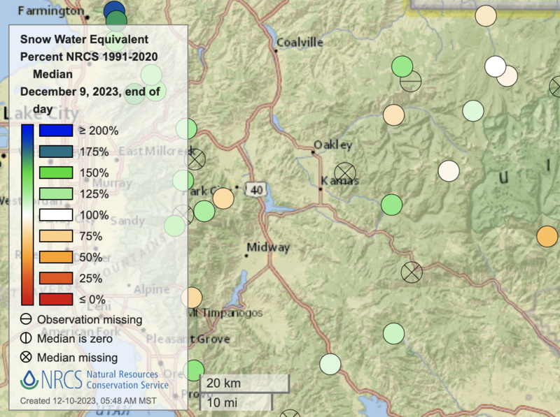 While it seems like a slow start to the season, in terms of water amounts, SNOTEL sites in the Western Uintas generally have median values. White dots are at the median. Green are a little above, and beige dots are a little below. Click on the image for an interactive map from the NRCS.