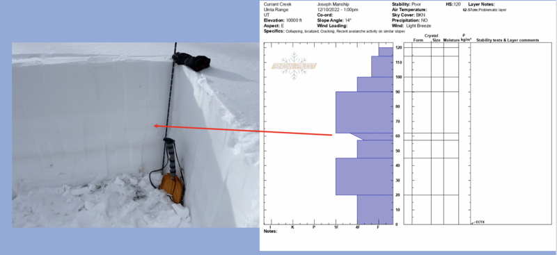 A pit profile from the Currant Creek zone shows exactly where the weaker, sugary, persistent weak layer (PWL) exists in the mid portion of our snowpack.