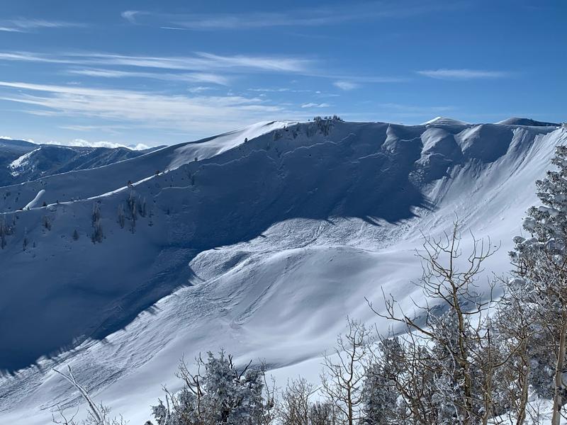 Most likely triggered from a cornice fall, the image above is a very large and connected (3' deep x 1200' wide) natural avalanche that occurred late Thursday on a steep East facing slope in Upper Weber Canyon.