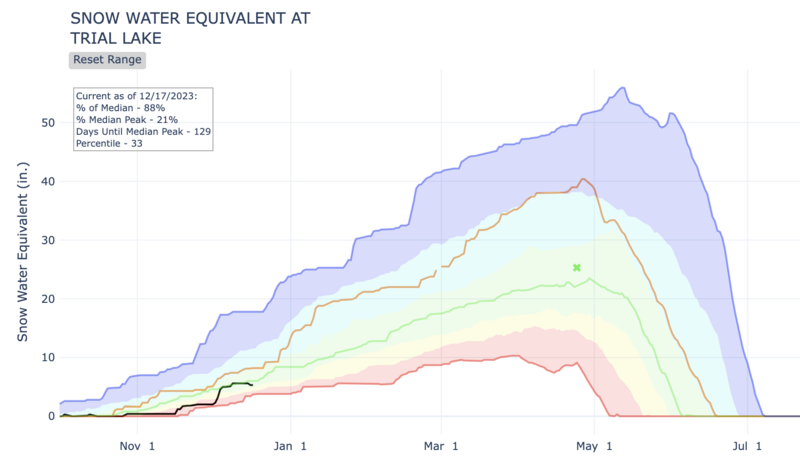 Below is a graph from the NRCS of precipitation at the Trial Lake SNOTEL site which has 24" snow (5.2" water). While it feels like a slow start to winter, the snowpack is just a little below average.