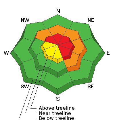 In the wind zone, at and above treeline, HIGH avalanche danger exists. Human triggered avalanches are VERY LIKELY in steep, wind drifted terrain. Slopes facing the north half of the compass, and particularly those with an easterly component to its aspect should be avoided.