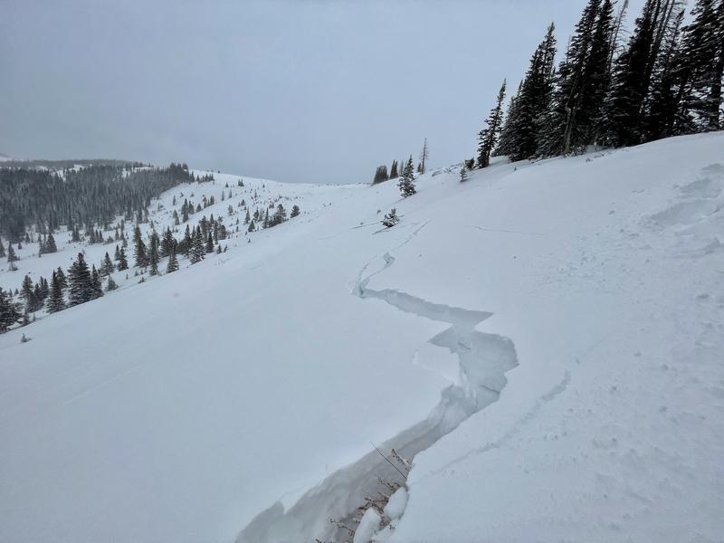 Thursday near Wolf Creek Pass, Mark experienced large collapses with huge shooting cracks on two wind-loaded, north-facing slopes. If they were steeper they would have produced avalanches. Remember- shooting cracks and collapses are a huge red flag and indicator of unstable snowpack conditions.