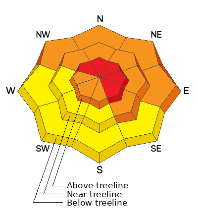 Look for HIGH avalanche danger on all steep, upper elevation slopes, especially those facing the north half of the compass, where strong winds continue forming fresh wind drifts atop weak faceted snow underneath. Both human triggered and natural avalanches are VERY LIKELY. In addition, winds have made their way into mid elevation terrain where you'll find a CONSIDERABLE avalanche danger and human triggered avalanches are likely. Even low elevation terrain is getting into the mix and you could get surprised on a steep slope right near the trailhead.