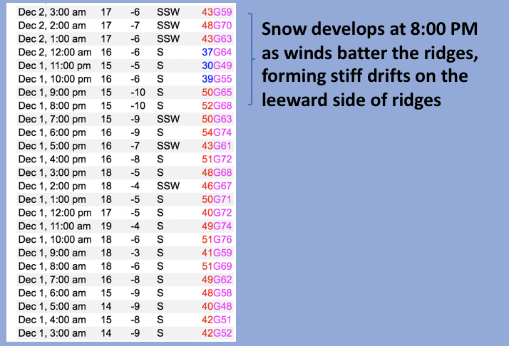 South and southwest winds crank at mid and upper elevations, easily whipping new snow into stiff, hard drifts. Remember- hard, dense snow can give us a false sense of snow stability, allowing us to travel further out onto a slope before it fails and brings the entire roof down on top of us. Found mostly on the leeward side of upper elevation ridges, due to the strength and duration of winds, I'd also be on the lookout for fresh drifts around terrain features like chutes and gullies. In either case, both new and older drifts now rest on weak, faceted, older snow and that means avalanches are gonna be easy to trigger.