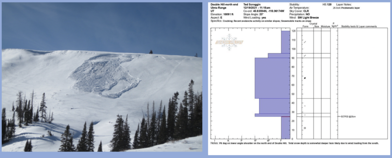 Ted was in Whitney Basin Sunday and reports widespread natural avalanching on many steep, northerly facing slopes like in the image above from Double Hill. The snowpit profile to the right, reveals there's no mystery to our snowpack structure... that's a lot of strong snow resting on a weak basement. Ted's got a great write up of his travels found HERE. In addition, there's no shortage of both human triggered and natural avalanches from last weeks storm and an updated list is found HERE