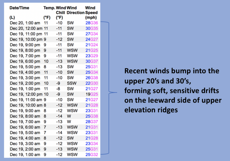 Southwest winds bumped into the 30's late Monday, whipping the snow into shallow, yet sensitive drifts along the leeward side of ridges and around terrain features like chutes and gullies.