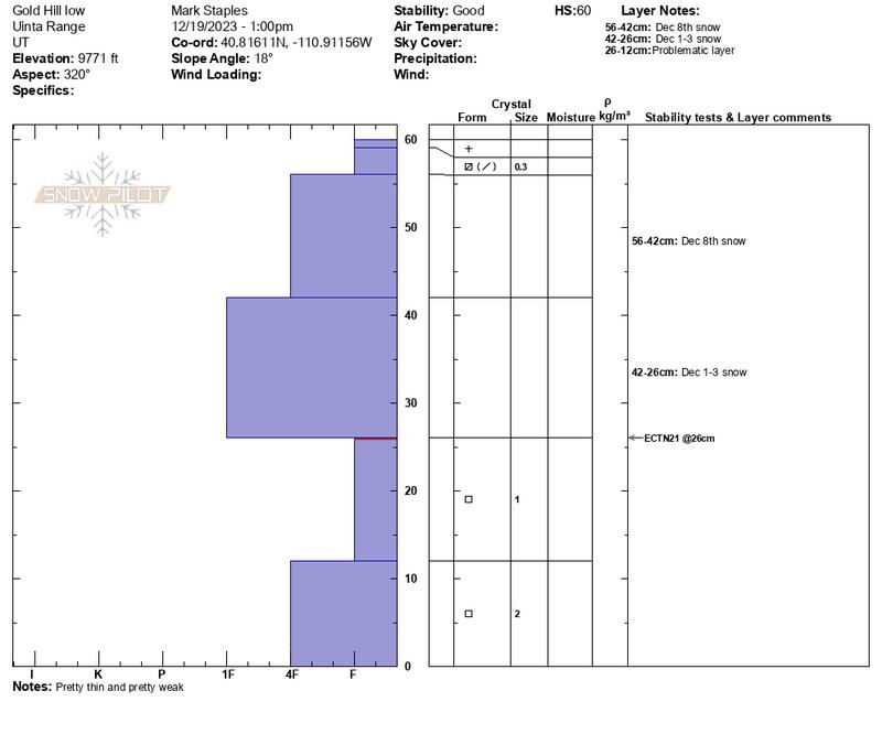 My trusted colleague Mark Staples and his partner Steve Martin (pro rider... not comedian :) stomped around Gold Hill yesterday and found very supportable snow and great riding conditions. Mark notes... "The old snow from November - this is unreactive now. It will certainly wake up on the north side of Gold Hill after several snow storms or one big one."