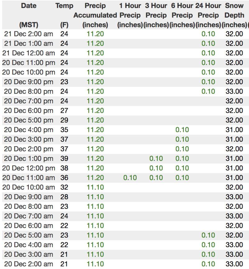 Above is recent hourly data from Trial Lake (9,945') along with wind data from Windy Peak (10,662'). To view more regional weather stations click here.