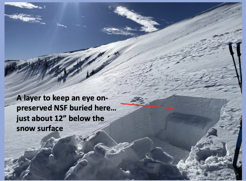 Second... last weeks series of little storms buried a sugary layer of near surface facets (NSF), capping and preserving this very delicate and notoriously tricky weak layer. Bo and Trevor found this mostly dormant structure in Upper Humpy Basin yesterday. Not much of a player at the moment, but something to keep an eye on once it starts storming again.