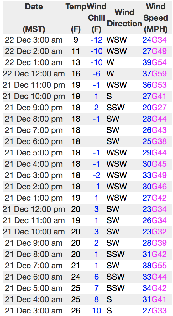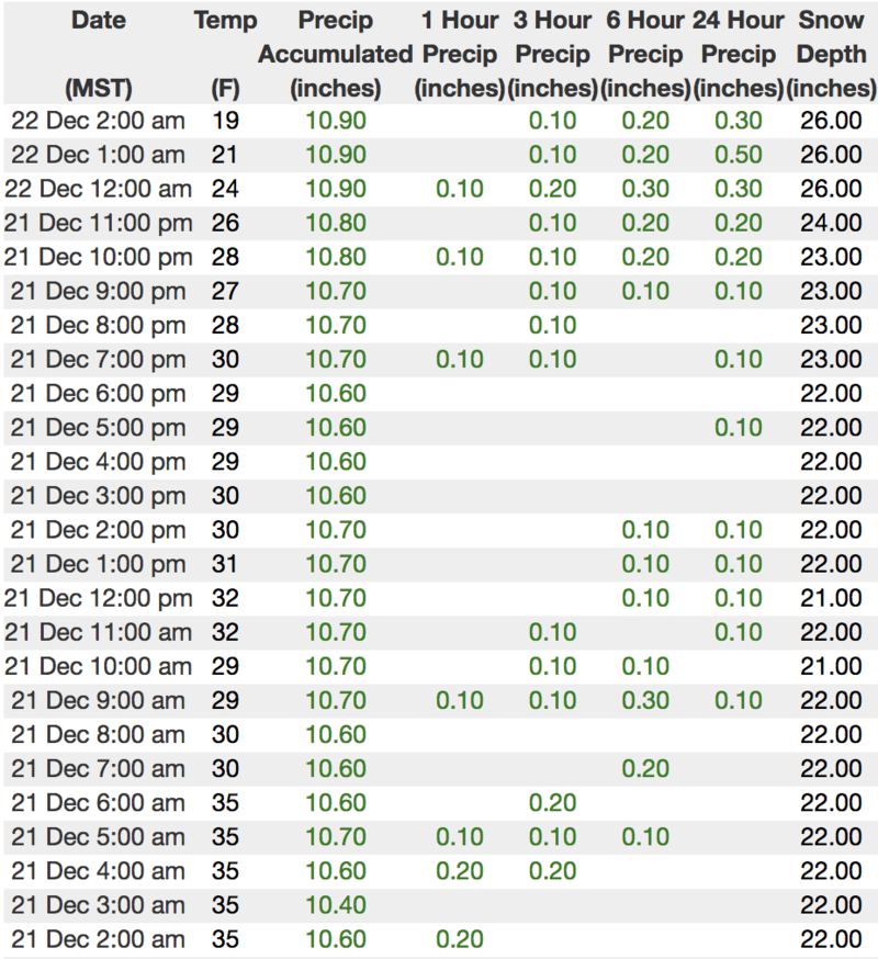 Above is recent hourly data from Chalk Creek (9,169') along with wind data from Windy Peak (10,662'). To view more regional weather stations click here.