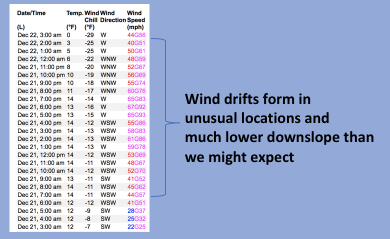 Winds blew from multiple directions and I bet you'll find shallow drifts all over the map, in some unusual locations, and lower downslope than we might expect to find them.