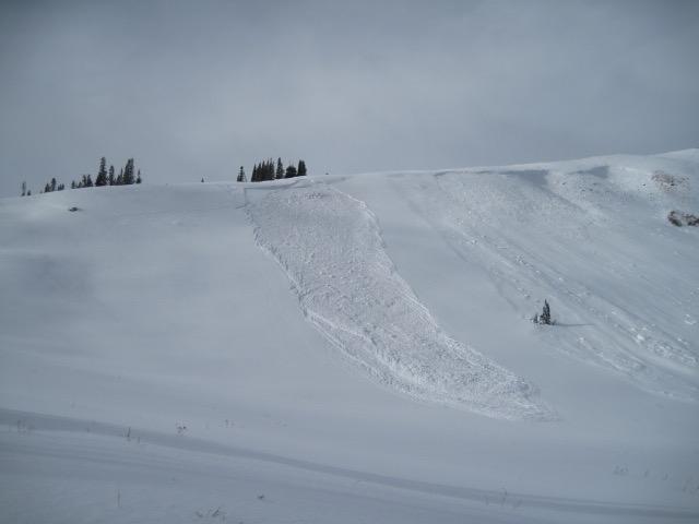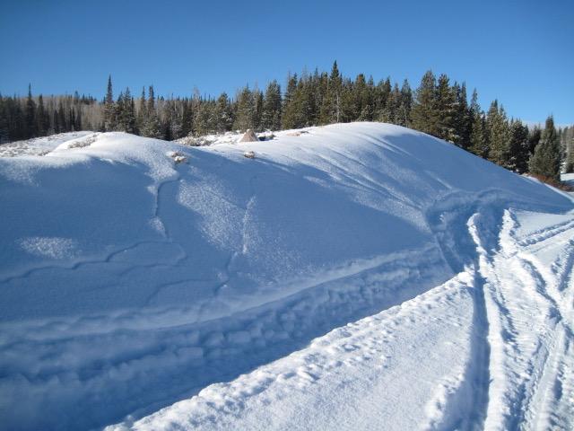 Above is a great illustration of one of our avalanche problems today. Our main man with the Uinta plan, Ted Scroggin, stomped around the Double Hill zone last Saturday, catching this fresh wind slab peeling off the ridge, which in turn, triggered a deeper slide as it crashed on the slope below.