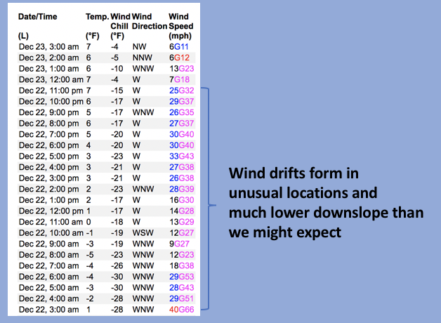 Winds are always the great equalizer on the eastern front and Wednesday nights hurricane force wind changed the landscape and tipped the scales. Now the tricky part... while some slopes avalanched naturally, others wait for a trigger like us to roll along and knock the legs out from underneath. And the most likely place to trigger an avalanche is where a dense, strong, solid layer (slab) rests on weaker snow (Persistent Weak Layer or PWL) formed during the mid November dry-spell. That combo is found on slopes facing the north half of the compass, especially those in the wind zone at and above treeline, and particularly on slopes with an easterly component to their aspect. So, by avoiding this setup, you essentially avoid avalanches!