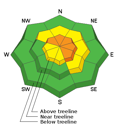 In the wind zone, at and above treeline, CONSIDERABLE avalanche danger exists. Human triggered avalanches are LIKELY on steep, wind drifted slopes. Terrain facing the north half of the compass, and particularly slopes with an easterly component to its aspect should be avoided.