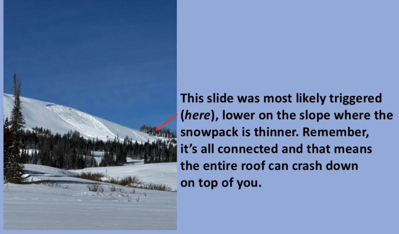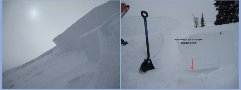 Strong snow on top of weaker snow... that snowpack setup isn't entirely unusual for us. What is unusual is that avalanches aren't breaking to weak sugary snow near the ground, that layer is solid and happy in its own skin. Rather... slides are failing on the persistent weak layer formed during the mid November dry-spell and that layer rests a couple feet off the ground. What's important to note is that avalanches now have a smooth surface with little resistance and that means they'll break wider and deeper and run faster and further than you might expect.