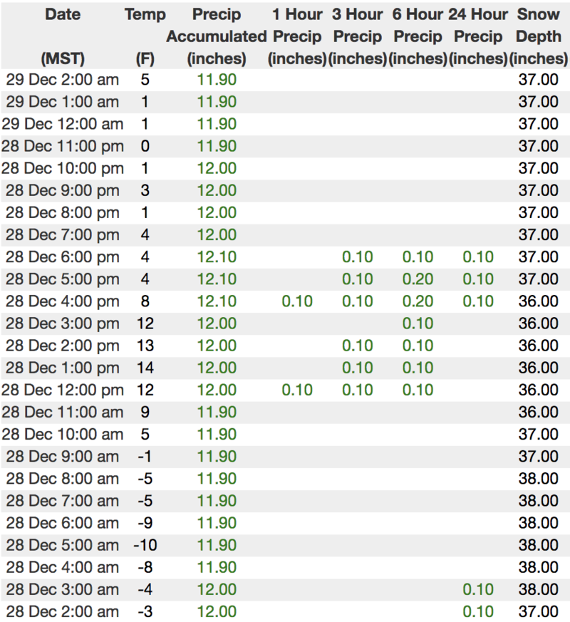 Above is recent hourly data from Trial Lake (9,945') along with wind data from Windy Peak (10,662'). To view more regional weather stations click here.