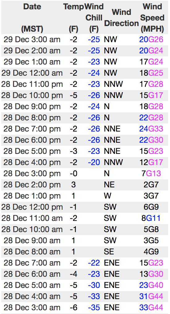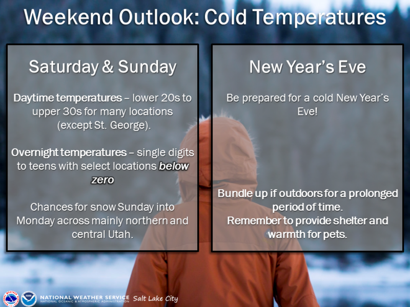 After a mostly sunny start to the day, clouds and wind increase as the day wares on. High temperatures rise into the mid 20's with overnight lows dipping into the teens. Northwest winds begin cranking late today and should be blowing in the 50's by about sunrise Sunday. Look for a good shot of snow developing throughout the day with 8"-10" stacking up by early Monday. The coldest air of the season is expected to arrive behind this storm system Monday, before warming begins on New Years Day