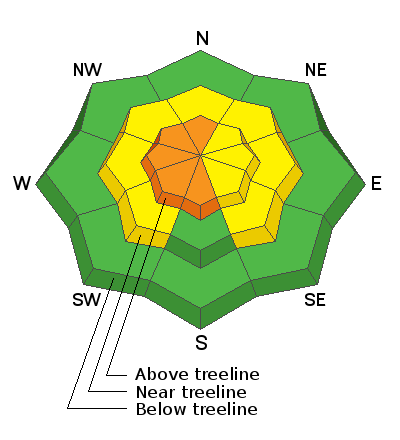 In the wind zone, at and above treeline, you'll find pockets of CONSIDERABLE avalanche danger. Human triggered avalanches are LIKELY on steep, wind drifted slopes. Steep terrain facing the north half of the compass, and particularly slopes with a westerly component to its aspect are most suspect and should be avoided.