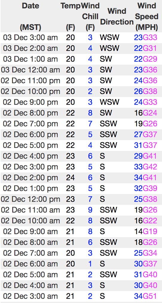 Above is 24 hour weather data from Windy Peak (10,662') and Trial Lake (9,945')