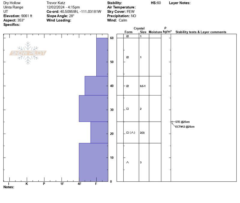 Trevor submitted the snow profile above from the Soapstone environs and comments... "A thin, shallow, weak, trap door, faceted snowpack is present in Dry Hollow. All layers observed contain angular grains of one kind or another, and the snowpack does not support much skier weight as a result."