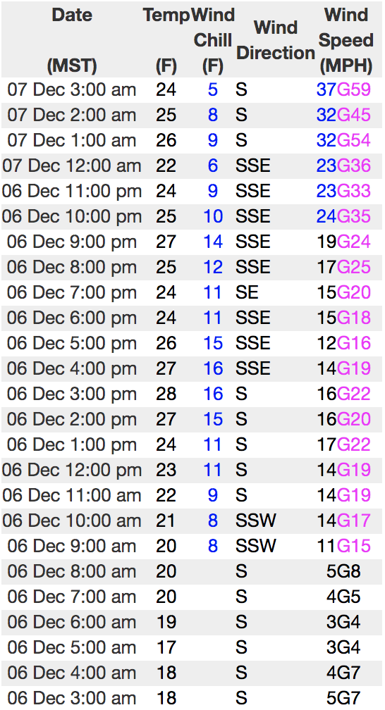 Above is 24 hour weather data from Windy Peak (11,186') and Trial Lake (9,945')