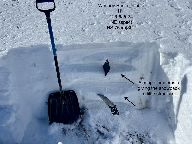 Ted's snowpit profile above from Double Hill suggests a bit of structure in areas where the snowpack is deepest, while shallow snowpack zones on lower elevation, shady slopes are turning into a weak, sugary, sandbox.