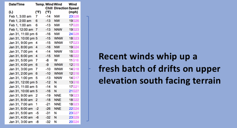 The image above reflects a 24 hour data dump from Windy Peak (10,662') illustrating winds delivering shallow drifts to terrain facing the south half of the compass.