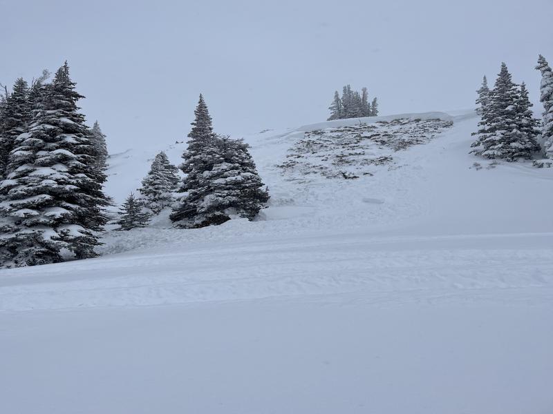 Viz has been less than ideal, but on Thursday, we did get a report of a remotely triggered slide (from a distance) by a small crew of riders. Not huge, but the big red is... the avalanche broke on weak snow close to the ground on a steep, heavily wind loaded, rocky slope in the Currant Creek Peak area.
