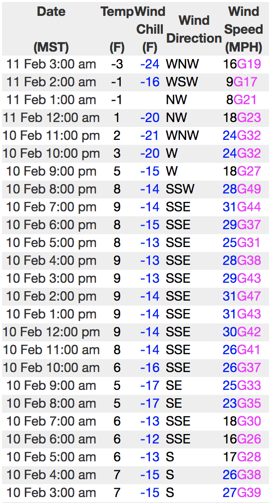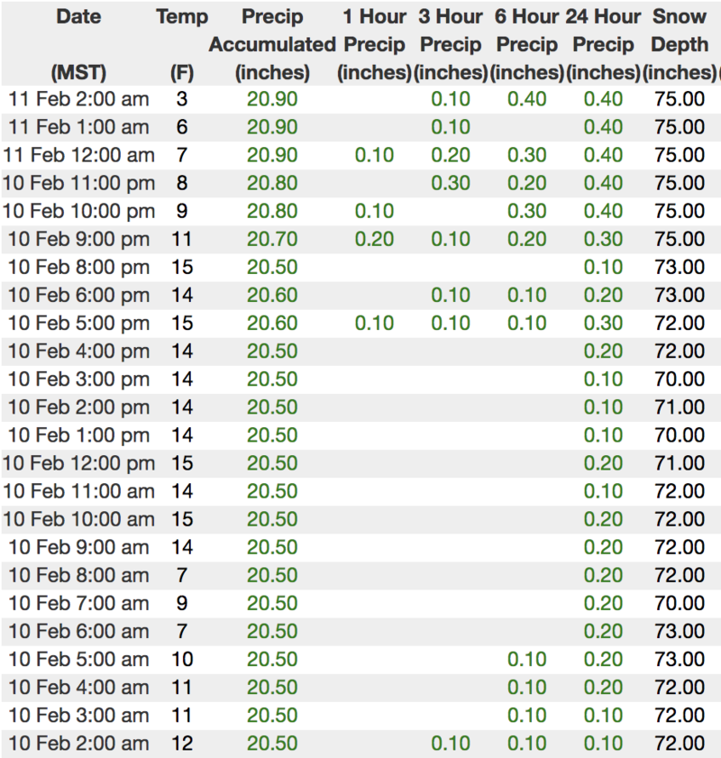 Above is hourly data from Trial Lake (9,945') and Windy Peak (10,662'). To view more regional weather stations click here.