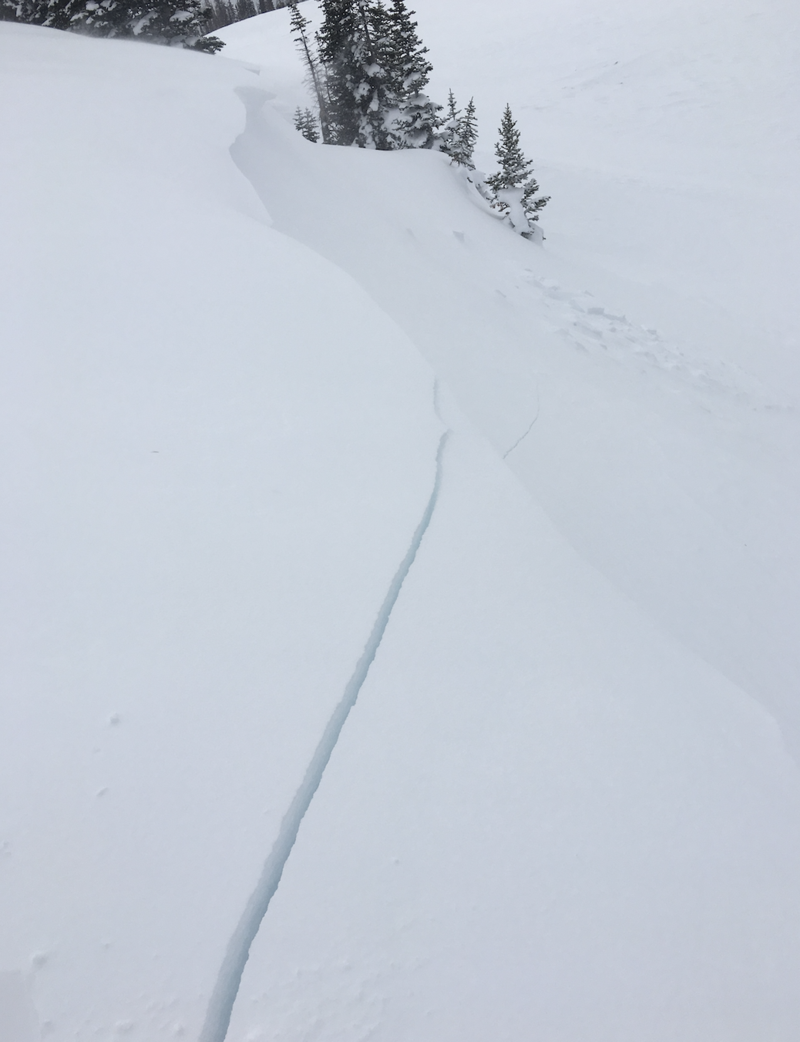 Weston D was in Smith-Moorehouse yesterday and found sensitive wind drifts developing late in the day. Remember- shooting cracks like in the image above are huge clues to unstable snow.