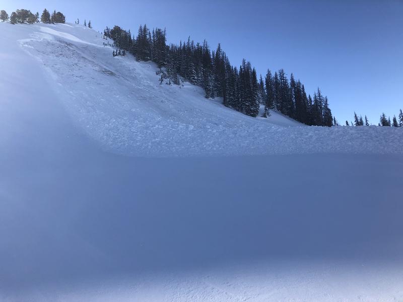 From yesterday, a shallow wind slab intentionally triggered from above, knocked the legs out from under a bigger piece of snow, which then quickly broke to the ground. This is "repeater" path, broke deep and wide right after the turn of the New Year and has harbored weak snow near the ground since flushing out.