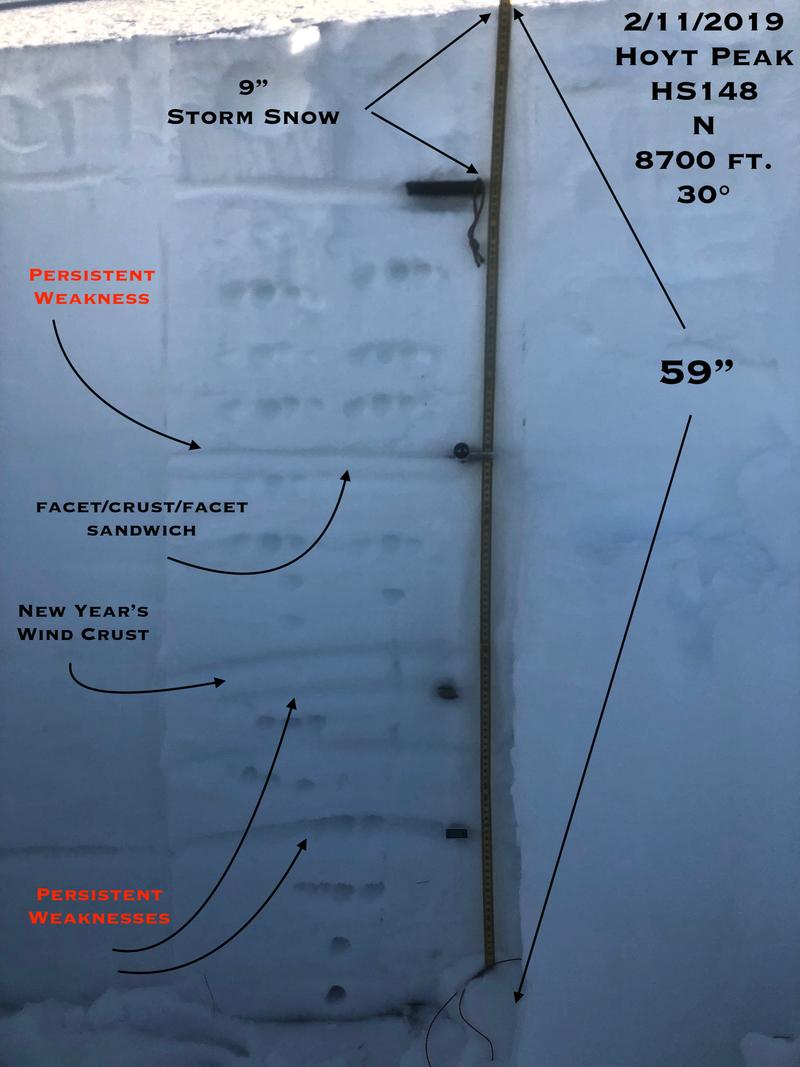 JG's snowpit profile clearly shows our current layering and here he brilliantly describes what he's seeing.... "You really get a false sense of security when you are walking, skiing or sledding on such a supportable snowpack. Based on recent avalanches, what I have been seeing in my travels and what I have been seeing in my snowpits I don't think we are close to being out of the water. It's hard to not want to jump into steep terrain when there aren't a lot of visual signs to make you take a step back. Dig in the snow and see for yourself. Just read about the recent tragedies and close calls, it's sobering. Low angle is plenty fun right now, have fun and live another day. The forecast has been spot on, heed the warnings, the Uintas are sketchy right now. "