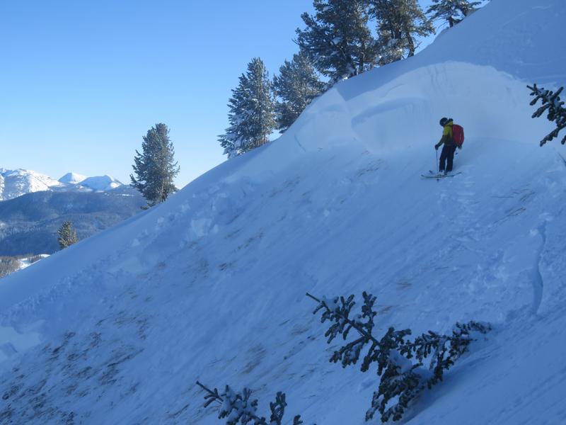 Let's face it.... we've had lots of snow recently and there's no shortage of fresh snow to blow around. For days, southerly winds cranked, drifting snow into obvious terrain, but also forming slabs at lower elevations, which is unusual for us. So for today, I suspect we're dealing with several layers of wind drifted snow and these thick layers involve several storms, are more connected, and may break deeper than we might anticipate. While most prevalent on the leeward side of mid and upper elevation ridges, drifting also occurred around terrain features like chutes, gullies, and sub-ridges. In addition, yesterday mornings winds cranked even down low near the trailheads, so expect to find fresh drifts in unusually low elevation terrain. In any case, today you'll want to look for and avoid any fat, rounded piece of snow, especially if it sounds hollow like a drum.