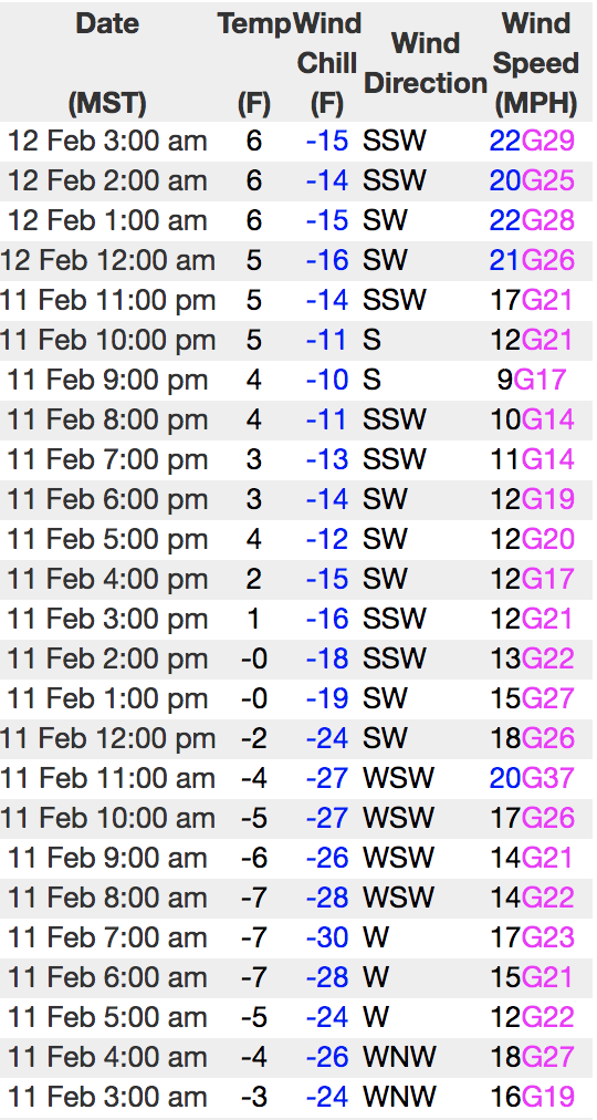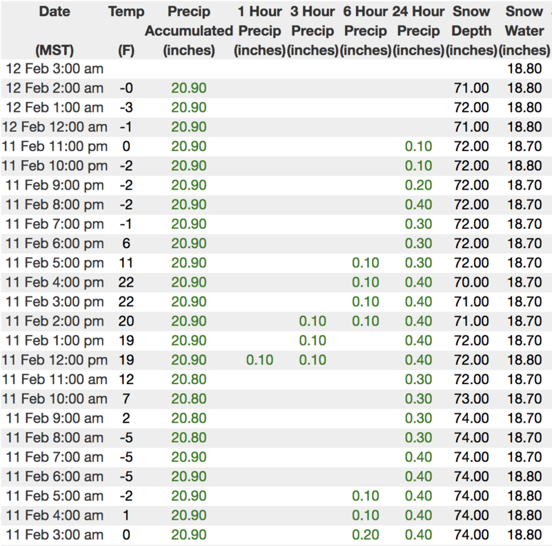 Above is hourly data from Trial Lake (9,945') and Windy Peak (10,662'). To view more regional weather stations click here.