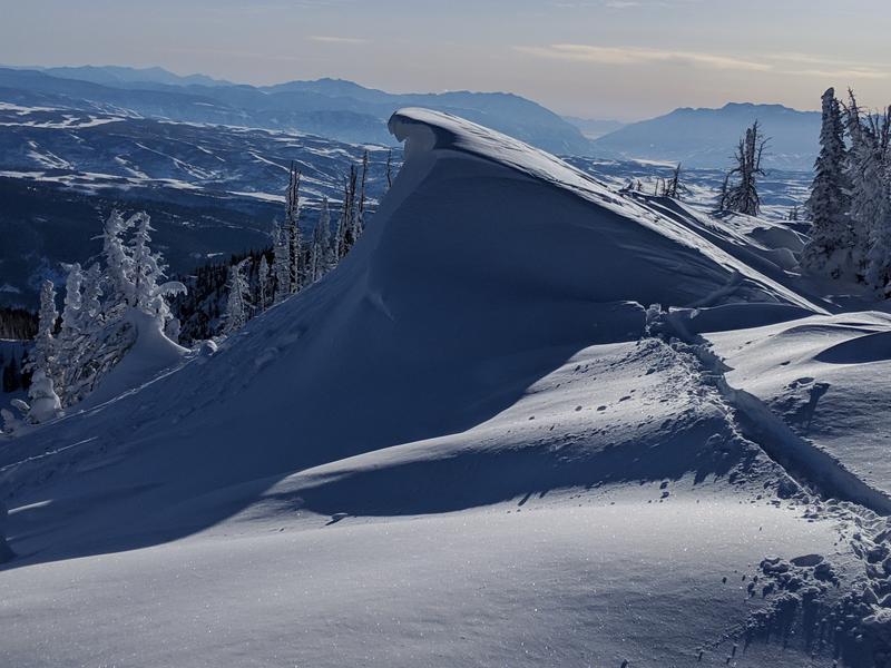 Fresh wind slabs formed overnight, adding yet another layer of wind drifted snow. Now our wind slabs involve several storms, so they're more connected, and may break deeper than we might anticipate. While most prevalent on the leeward side of mid and upper elevation ridges, drifting also occurred around terrain features like chutes, gullies, and sub-ridges. In addition, this mornings winds are cranking even down low near the trailheads, so expect to find fresh drifts in unusually low elevation terrain. In any case, today you'll want to look for and avoid any fat, rounded piece of snow, especially if it sounds hollow like a drum.