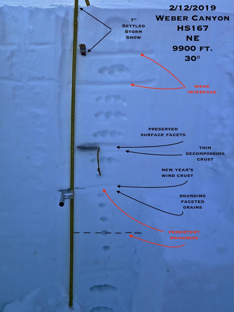 JG's snowpit profile clearly shows our current layering... perhaps getting slightly hard to trigger, but once you collapse the slope it's game over. Here JG brilliantly describes what he's seeing.... "You really get a false sense of security when you are walking, skiing or sledding on such a supportable snowpack. Based on recent avalanches, what I have been seeing in my travels and what I have been seeing in my snowpits I don't think we are close to being out of the water. It's hard to not want to jump into steep terrain when there aren't a lot of visual signs to make you take a step back. Dig in the snow and see for yourself. Just read about the recent tragedies and close calls, it's sobering. Low angle is plenty fun right now, have fun and live another day. The forecast has been spot on, heed the warnings, the Uintas are sketchy right now. "