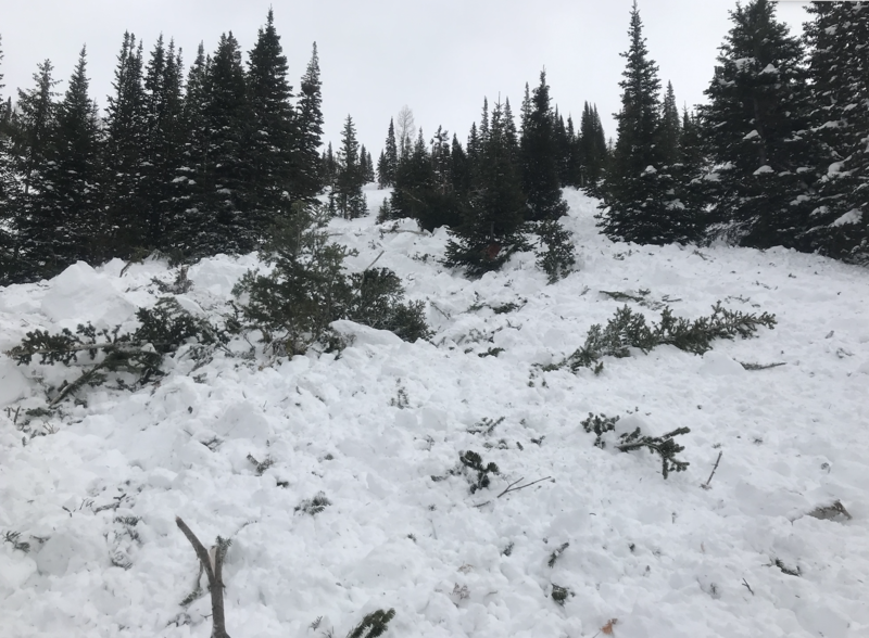 A close call in Mill Hollow on Saturday as a snow biker was buried as he triggered this steep slope above the summer road. Lucky his hand was sticking out of the snow and everyone in the group was prepared for their own self rescue, quickly digging their partner out of the snow. This story has a happy ending. A first hand account with poignant take home points found here.