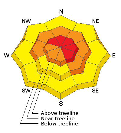 Recent snow and wind are overloading our fragile snowpack and HUMAN TRIGGERED AVALANCHES ARE VERY LIKELY. In the wind zone, above and near treeline, the avalanche danger is HIGH especially on slopes facing the north half of the compass. Once triggered, today's avalanches have the potential to quickly get out of hand, breaking deep and wide, resulting in a dangerous slide.